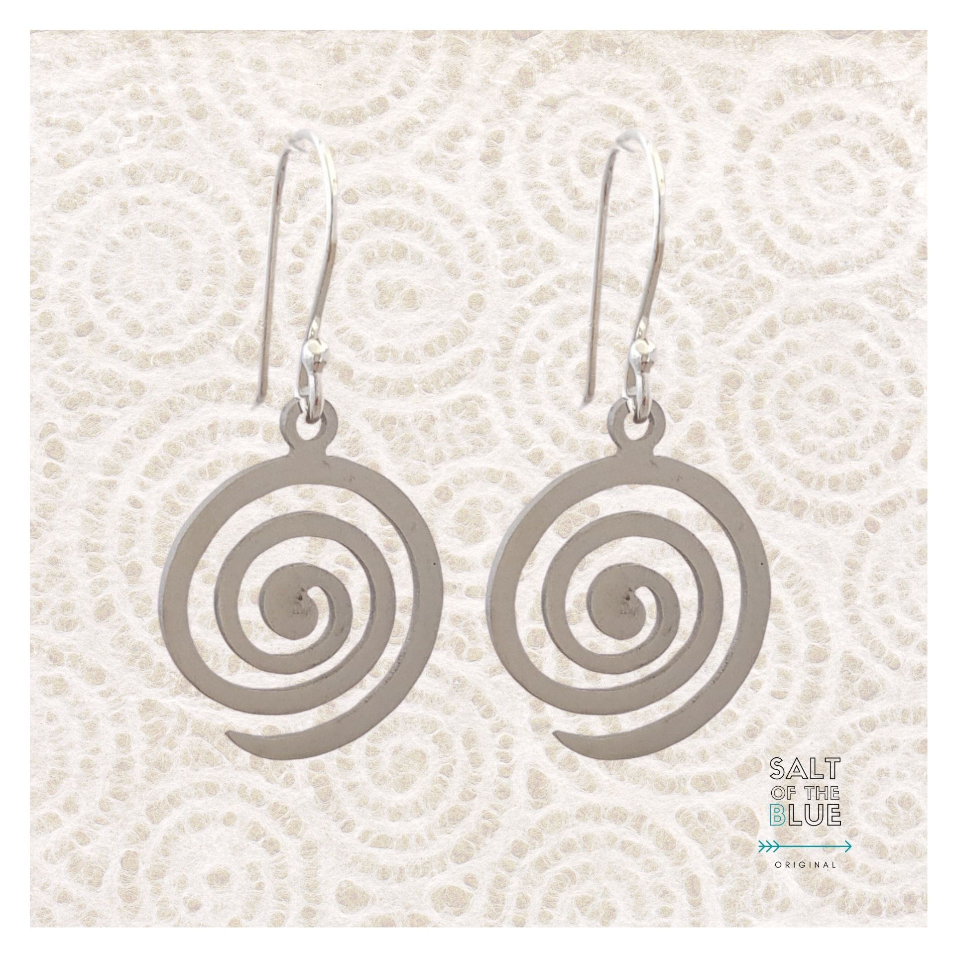 Salt of the Blue earrings featuring stainless steel laser cut spiral design on sterling silver hooks.