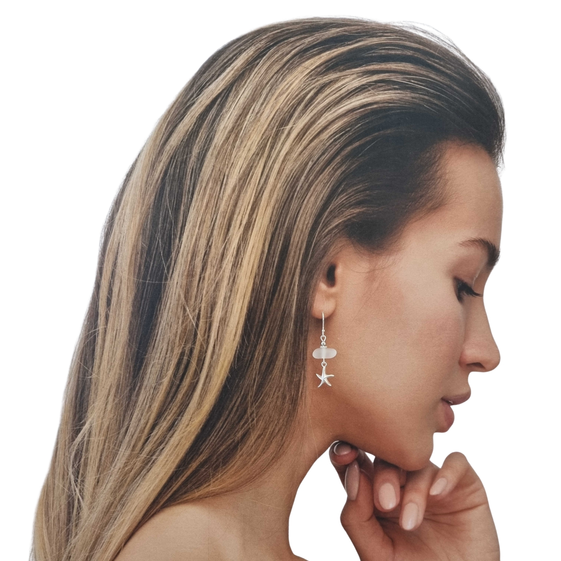 Salt of the Blue sea glass and sterling silver starfish earrings on sterling silver hooks. As each piece of sea glass is unique you will receive the earrings photographed.